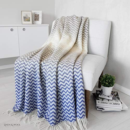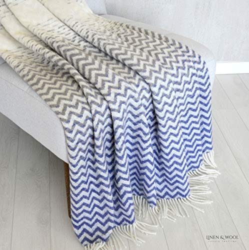 Linen & Cotton Luxus Warme Decke Wolldecke Bunt Wohndecke Kuscheldecke Aurora – 100% Reine Neuseeland Wolle, Marine Blau/Grau (130 x 170cm) Sofadecke/Überwurf/Plaid Couch Sofa/Schurwolle Blanket