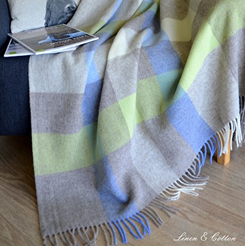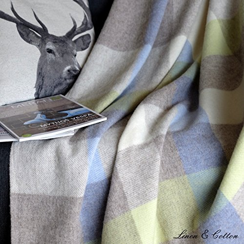 Linen & Cotton Warme Decke Wolldecke Kariert Wohndecke Kuscheldecke Devon – 100% Reine Neuseeland Wolle, Blau/Grau/Grün (140 x 200cm), Sofadecke/Tagesdecke/Überwurf Plaid Blanket/Schurwolle
