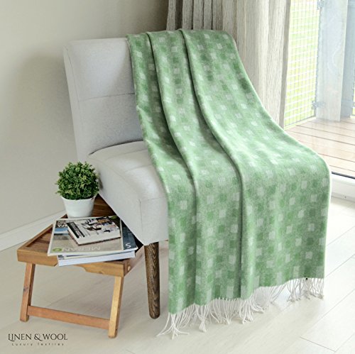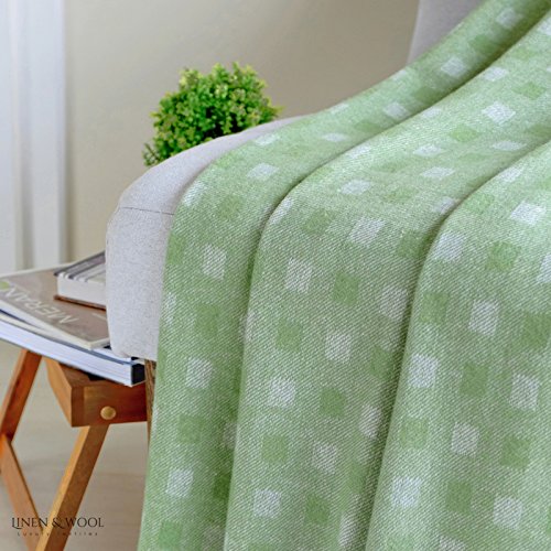 Linen & Cotton Warme Decke Wolldecke Merino Wohndecke Kuscheldecke Emma mit Karomuster – 100% Weicher Merinowolle, Grün/Weiß/Weiss (140 x 200 cm), Sofadecke/Tagesdecke/Überwurf/Plaid/Schurwolle