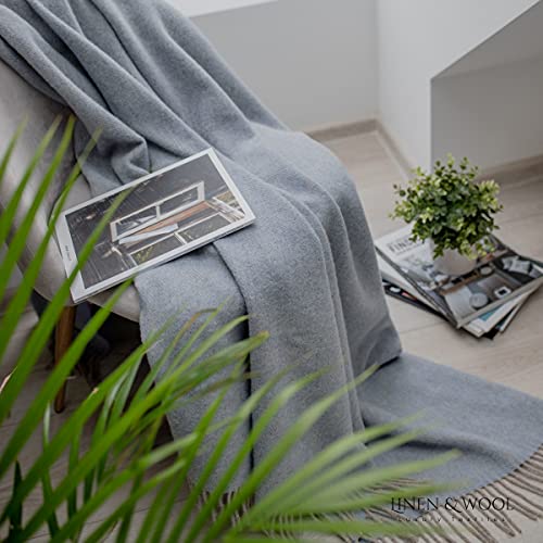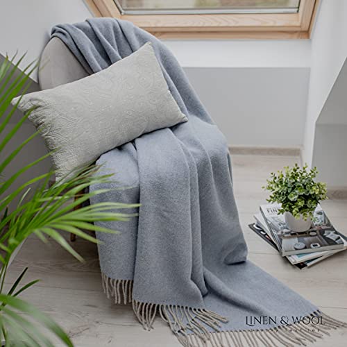 Linen & Cotton Weiche Warme Decke Wolldecke Wohndecke Kuscheldecke Columbus – 100% Reine Neuseeland Wolle, Beige Natur Hellblau Blau (140 x 200 cm) Couchdecke Überwurf Plaid Winter Sofa Schurwolle