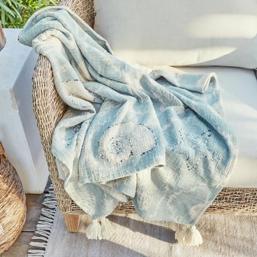 Plaid Calerand, Maritime Print-Motive, Verziert mithilfe Pailletten außerdem Glasperlen, Quasten an den Ecken, Überwurf, Tagesdecke, Wohndecke, Baumwolle