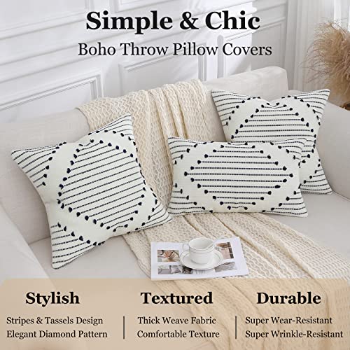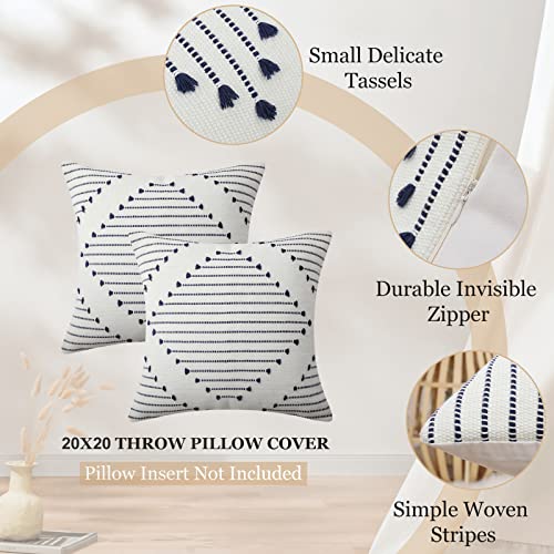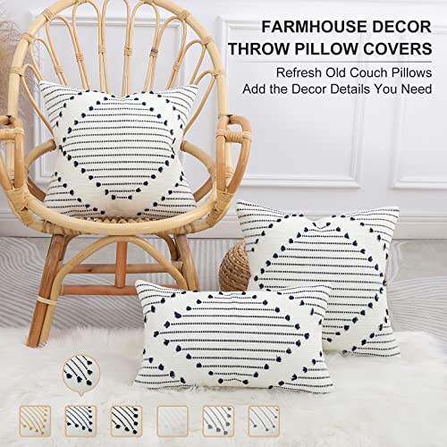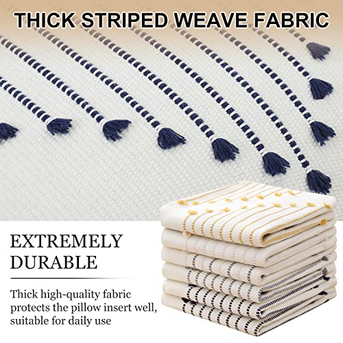 Boho & Farmhouse – Diese marineblauen und cremeweißen Outdoor-Kissenbezüge sind mit marineblauen Quasten auf cremeweißer Basis gewebt, einfache, neutrale Muster verleihen diesen gestrickten strukturierten Bezügen einen modernen Boho-Stil