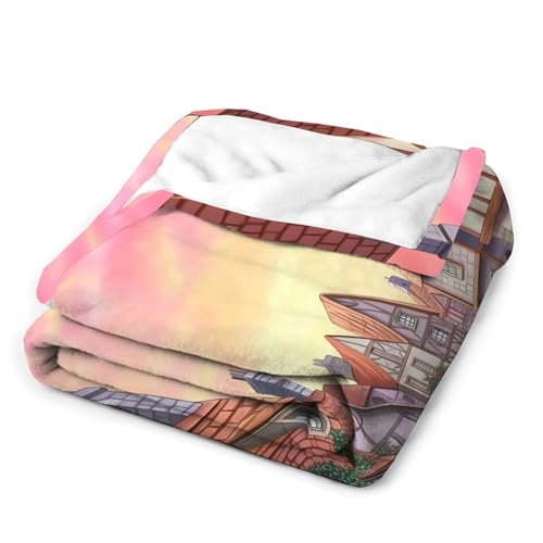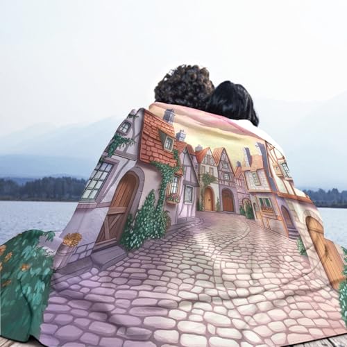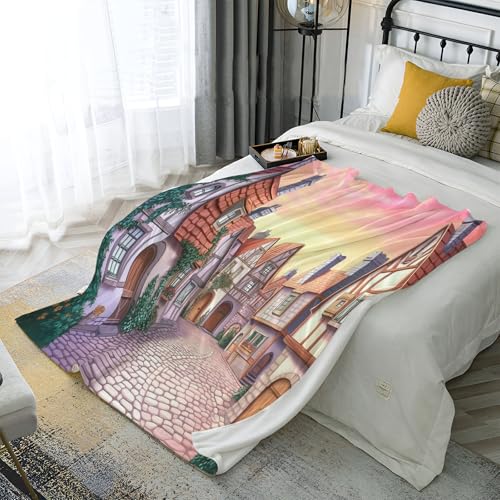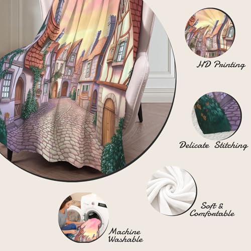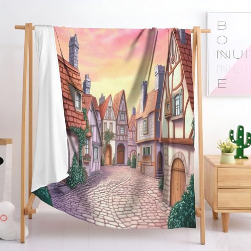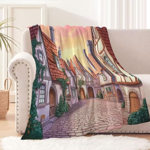 MIATCENRT Decke Flauschig, Kopfsteinpflaster Straße Winterdecke Wärmedecke Fleecedecke, 3D Cartoon Gebäude Drucken Reisedecke für Kinder, Mädchen, Erwachsene, Sofadecke 150x200cm Bettwaren