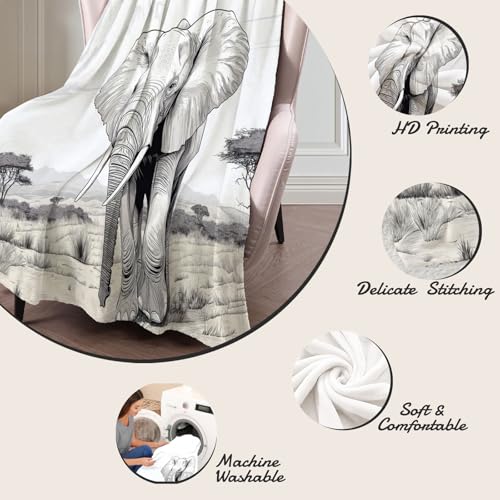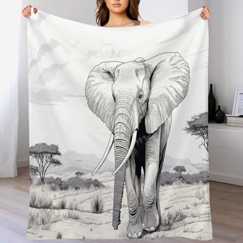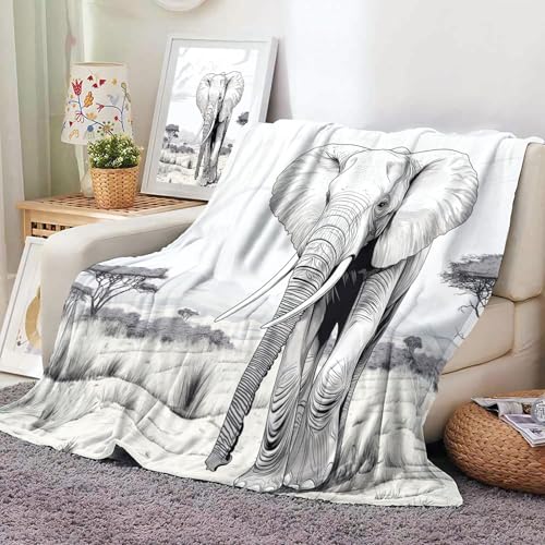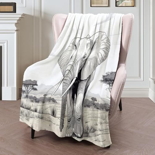 MIATCENRT Grasland Elefant Bedruckt Flanell Decken, Kinderdecke 3D Druck Linie Kunst Flauschige Plüsch Decke, Weiß Wohndecke Fleece Tagesdecke Decke TV Decken für Bett Sofa 200x220cm
