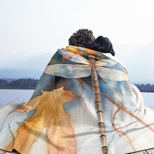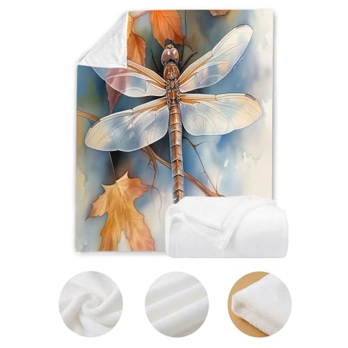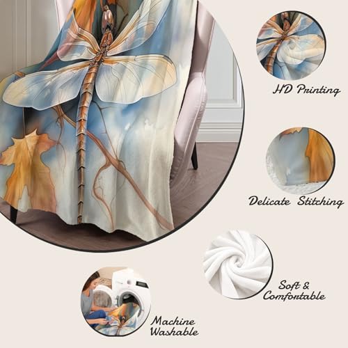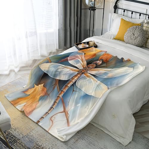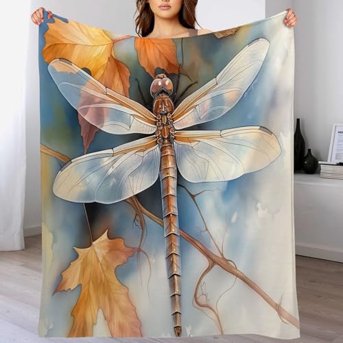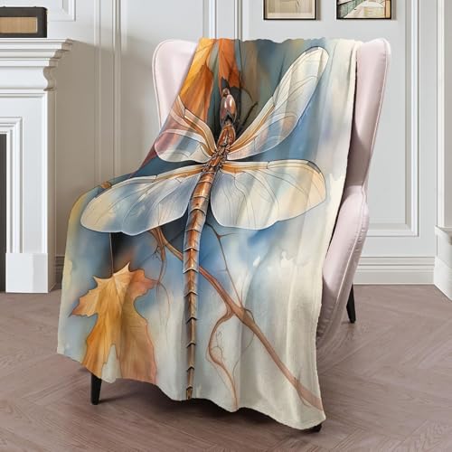 MIATCENRT Herbstblätter Libelle Bedruckt Flanell Decken, Kinderdecke 3D Druck Aquarell Flauschige Plüsch Decke, Blau Weiß Wohndecke Fleece Tagesdecke Decke TV Decken für Bett Sofa 150x200cm