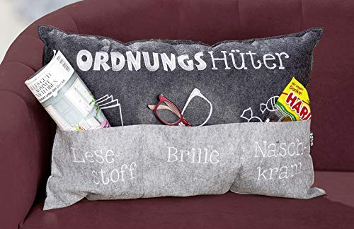 Weiches Deko-Kissen aus Filz mit drei Einstecktaschen für Lesestoff, Brille und Naschkram. Passende Stickerei zum Motto Ordnungshüter-Kissen.