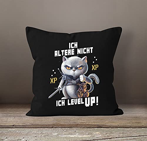 - Motiv: lustige Videospiel-Figur, Katze mit Spruch „Ich altere nicht, ich level up“