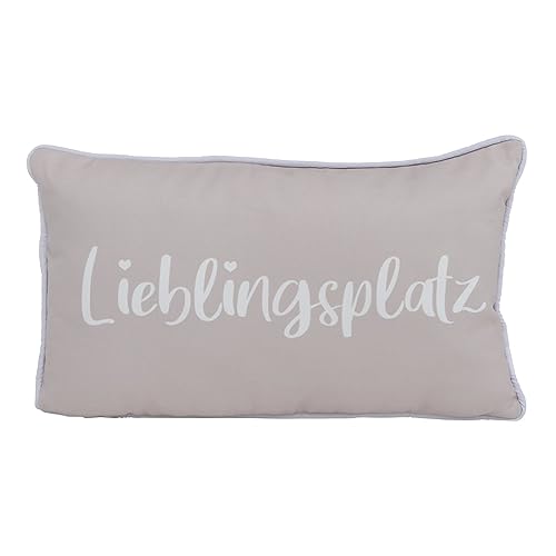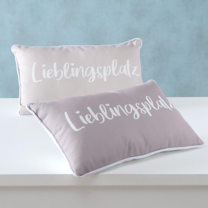 DESIGN: Set jeder zwei dekorativen Kissen in Hellbraun und Beige mit elegantem ‚Lieblingsplatz‘ Schriftzug und weißer Paspel