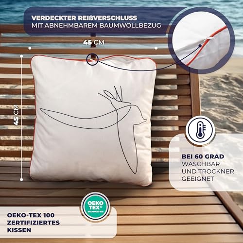 🐚 [Maritimes Ambiente] Unser 45×45 cm großes Sofakissen mit Füllung und Bezug im stilvollen nautischem Design bietet Ihnen als kuscheliges Polster optimalen Liegekomfort & bringt Ihnen Urlaubsgefühle direkt ins Wohnzimmer und nach Hause.