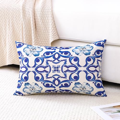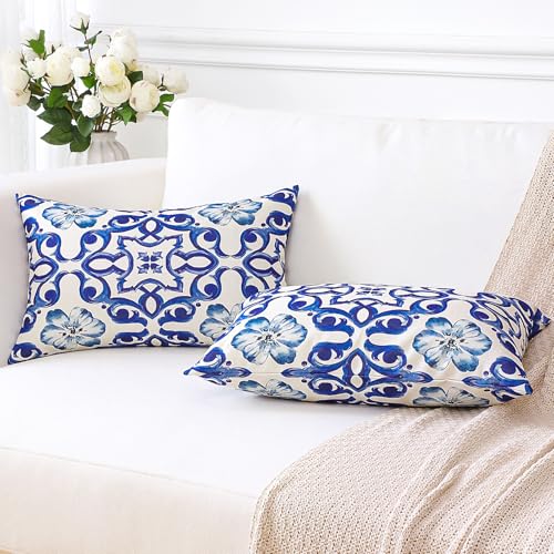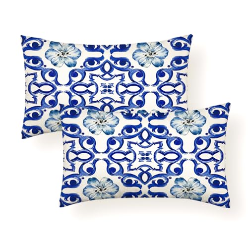 Ohok 2er Set Doppelseitige Motiv Kissenbezug, Polyester Leinen Zierkissenbezüge Modern Dekokissen Kissenhülle Set für Sofa Couch Wohnzimmer Schlafzimmer (Blaues und Weißes Porzellan Blumen D, 30x50cm)