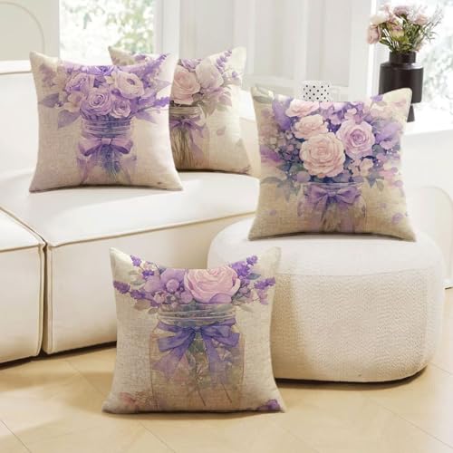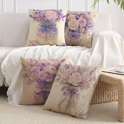 Outdoor Kissen Blume Kissenbezug 80×80 cm Lila, 4er Set Outdoor Kissen Wetterfest mit ReißVerschluss Dekokissen Samt Kissenhülle für Sofa Schlafzimmer Wohnzimmer Terrassen Balkon Geschenke 1B-I