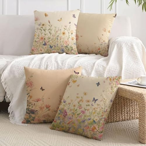 Outdoor Kissen Frühling Kissenbezug 80x80cm Pflanze, 4er Set Outdoor Kissen Wetterfest mit ReißVerschluss Dekokissen Samt Kissenhülle für Sofa Schlafzimmer Wohnzimmer Terrassen Balkon Deko 45-I