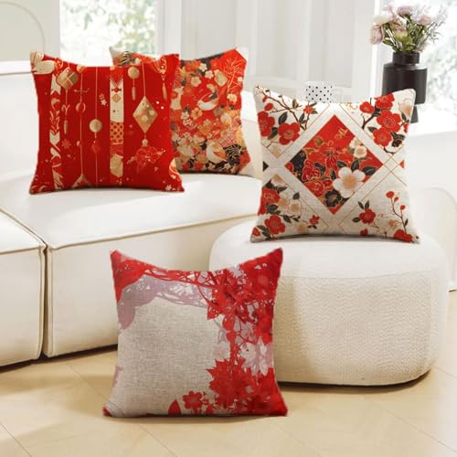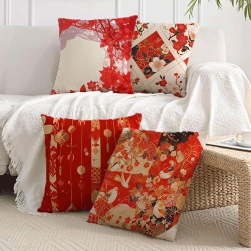Outdoor Kissen Rot Kissenbezug 80×80 cm Retro, 4er Set Outdoor Kissen Wetterfest mit ReißVerschluss Dekokissen Samt Kissenhülle für Sofa Schlafzimmer Wohnzimmer Terrassen Balkon Deko Geschenke 93-J