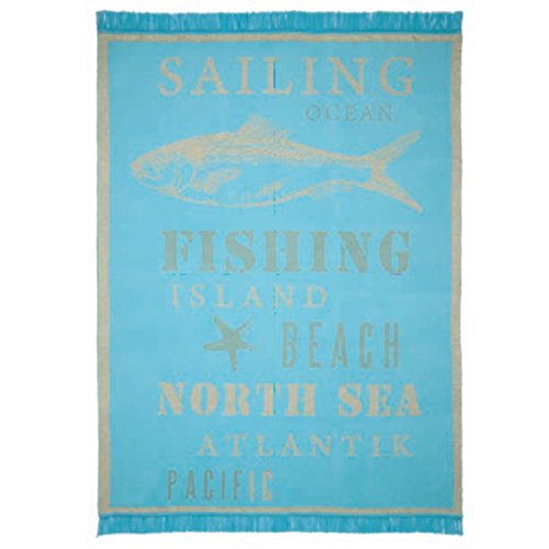 Hochwertige Kuscheldecke mit Hilfe von maritimen Leitgedanke in Zyan u. a. schöner Fransenkante. Die Schriftzüge rund ums Segeln, Angeln u. a. einem eingewebten Fisch aufrütteln die Sehnsuch nachdem Urlaub am oder uff dem Meer.