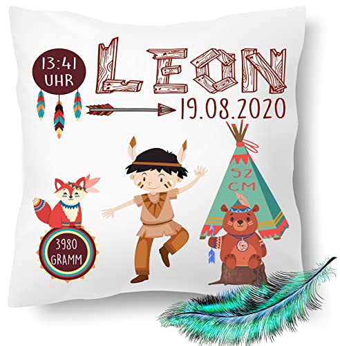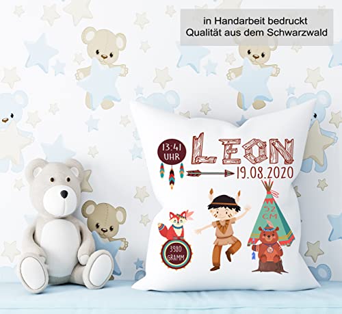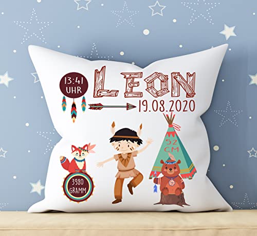 Personalisierbares Kissen zur Geburt für Jungen und Mädchen, Geburtskissen mit Namen, Geschenk, bedrucktes Indianer Kissen | Dekokissen, Zierkissen, Taufe | Kuschelkissen 40X40 (mit Kissenfüllung)