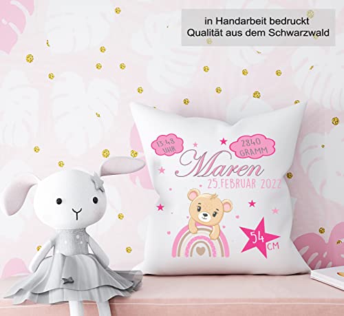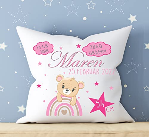 Personalisierbares Kissen zur Geburt für Jungen und Mädchen, Geburtskissen mit Namen, Geschenk, bedrucktes Teddy Rosa Kissen | Dekokissen, Zierkissen, Taufe | Kuschelkissen 40X40 (mit Kissenfüllung)