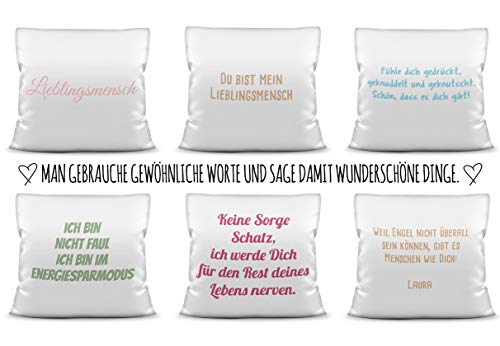 Ob als Kopfkissen, als Sofakissen, kleines Reisekissen oder einfach als schönes Zierkissen: Mit Lichtbild und/oder Spruch bedruckt sind personalisierte Kissenbezüge ein tolles persönliches Geschenk für Groß und Klein. Ein Kissen mit Spruch ist eine ideale Möglichkeit, eine Botschaft für einen lieben Menschen auf besondere Art und Weise zu übermitteln. Überraschen Sie Freunde und Familie mit einem besonderen Spruchkissen. Nicht mehr da Kissenhüllen sind auf links gedreht gut waschbar und in unterschiedlichen Farben und Oberflächenstrukturen erhältlich. Als Rundum-Sorglos-Paket ist eine passende Kissenfüllung natürlich gleich zumal. Durch den hochwertigen Auflage kommen Nicht mehr da Farben allerbest realistisch, betriebsam und brillant aufgebraucht unserer hauseigenen Produktion – Made in Germany. Als kleines Lieblings-Kopfkissen für die Reise oder das Mittagsschläfchen zwischendurch hat das bedruckte Kissen das Potential zum absoluten Lieblingskissen. Das perfekte Geschenk zum Geburtstag, zu Weihnachten oder einfach dennoch so als Ausdruck von Liebe als kleine Achtung zwischendurch.