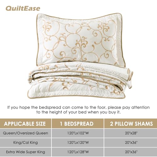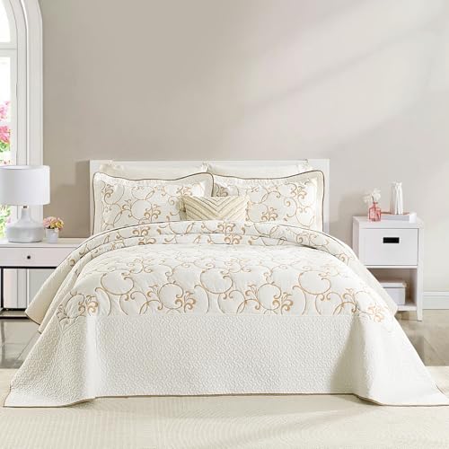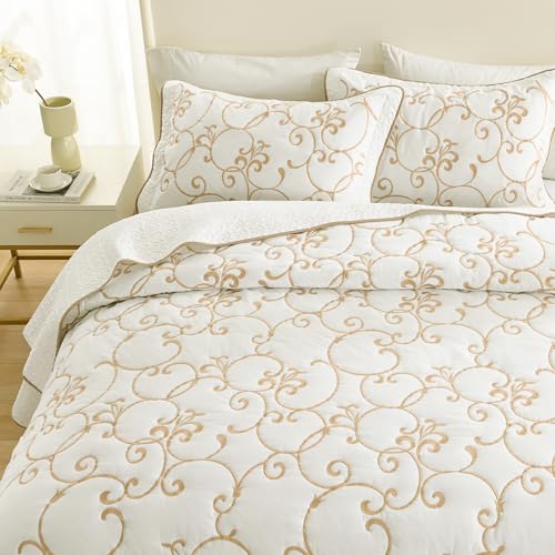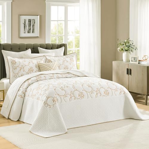 Perfektes Dekor-Design: Die Tagesdecke verfügt über ein Muster aus glatten Kurven und eleganten Bögen, die gewundenen Reben voller Leben und Vitalität ähneln. Der goldene Farbton verleiht einen Hauch von Luxus und kontrastiert wunderschön mit dem weißen Grundstoff, wodurch das Design auffälliger und auffälliger wird. Darüber hinaus ist der Grundstoff mit zarten Steppstrukturen verziert, die das goldene Muster verändern, was den visuellen Gesamteffekt verbessert und der Tagesdecke ein raffinierteres und komplizierteres Aussehen verleiht
