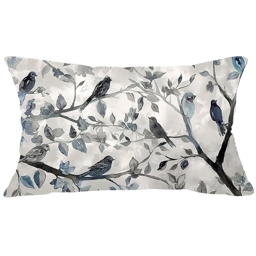 Ramirar Dekorativer Kissenbezug mit Tuschemalerei, Aquarell, Motiv: Vögel, Bäume, Blätter, dekorativ, weiches weißes Polyester-Samt, Lendenwirbelkissen, Dekoration, rechteckig, 30,5 x 50,8 cm