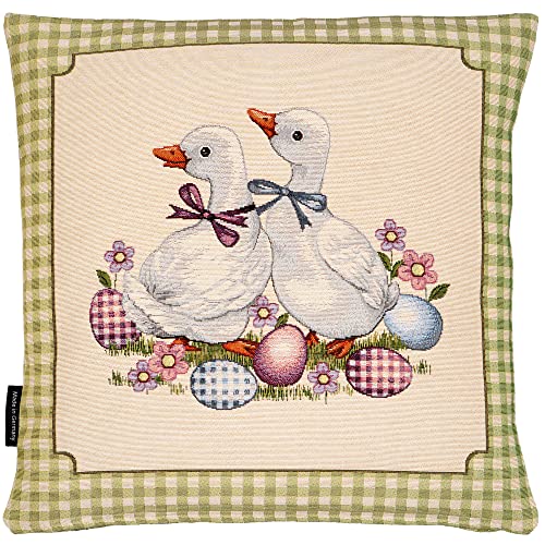 Eingewebte Motive Gänse mit Blumen und Osterei auf Vorder- u. Abseite der Ostern Kissenhülle