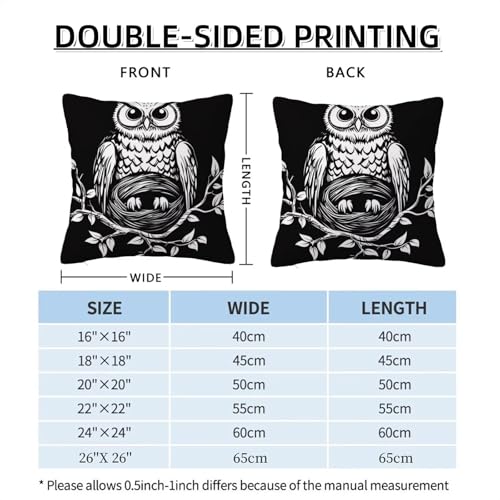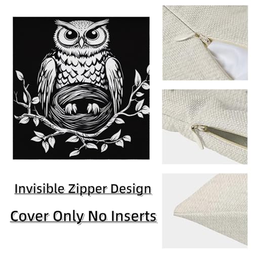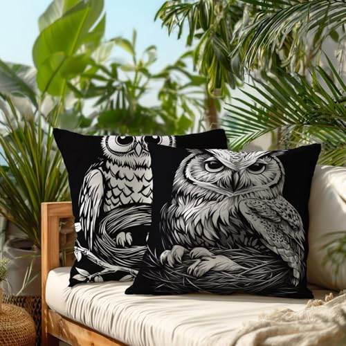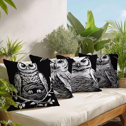 Schwarz und Weiß Kissenbezug 50×50, Outdoor Kissen Wetterfest 4 Stück, Kissenbezug Eule Leinen Dekokissen, Outdoor Sofakissen Zierkissen Wetterfest Beidseitiger Druck für Wohnzimmer, Terrassen H-1