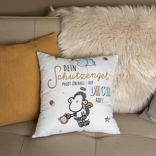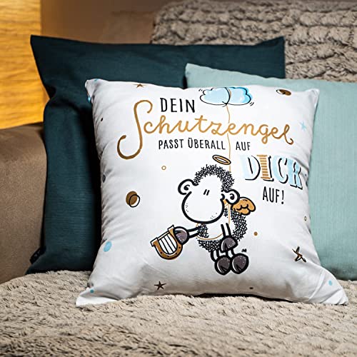 SHEEPWORLD KISSEN MIT SPRUCH: Kissen jedweder Baumwolle, Kissen mit Sheepworld Wendemotiv und Spruch „Schutzengel“, Absicherung 100% Baumwolle, Füllung 100% Polyester, 40 cm x 40 cm, Öko-Tex Standard 100 zertifiziert, Maschinenwäsche.