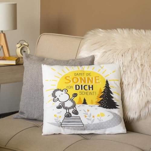 SHEEPWORLD KISSEN MIT SPRUCH: Kissen jeder Baumwolle, Kissen mit Sheepworld Wendemotiv und Spruch „Darob die Sonne für dich scheint“, Absicherung 100% Baumwolle, Füllung 100% Polyester, 40 cm x 40 cm, Öko-Tex Standard 100 zertifiziert, Maschinenwäsche.