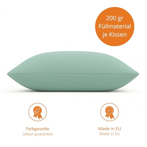 Füllung: Hoch moderne Polyesterfaser. Weich und gleichzeitig formstabil mit hoher Rückstellkraft. Optimale Anpassung in jeder Sitz- oder Liegeposition. 200 gr. Füllmaterial je Kissen