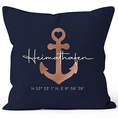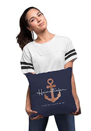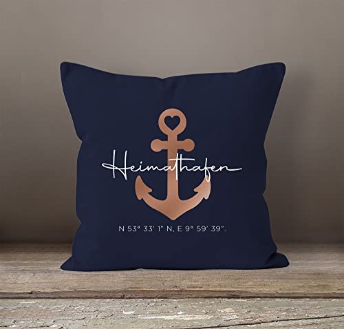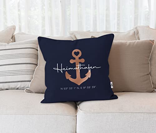 Wunderschöne Kissenhülle mit Abspannung Motiv und Schriftzug „Heimathafen“. Zusätzlich kann der Kissenbezug mit eigenem Text personalisiert werden. Eine tolle Geschenkidee zum Geburtstag, zu Weihnachten für den Partner, Familie, gute Freunde oder auch zum Einzug in ein neues Zuhause