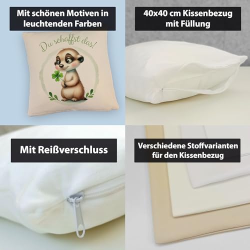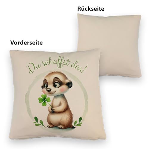 Lieferumfang: 1x Erdmännchen mit Kleeblatt Kissen mit Leinenoptik mit Spruch Du schaffst das