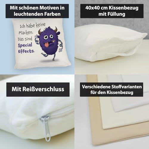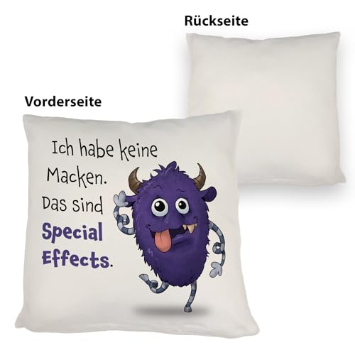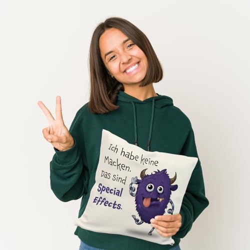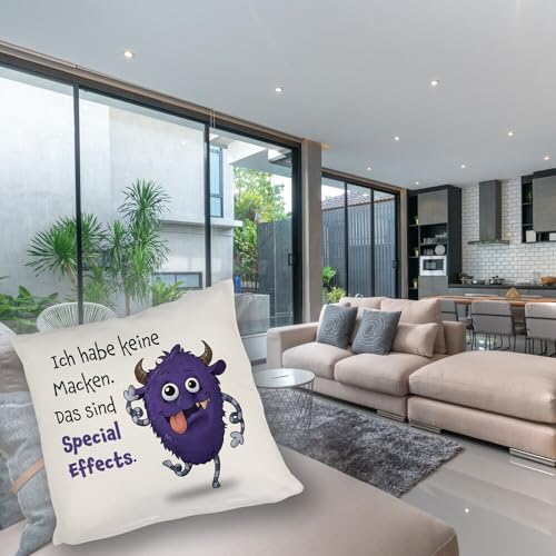 Der Spruch Ich habe keine Macken. Das sind Special Effects. ist eine humorvolle Anspielung auf unsere innersten Gedanken, die wir lieber für uns behalten. Er verleiht dem Kissen eine zusätzliche freche Schreiben und ist ein Augenzwinkern an leer, die wissen, dass unser Kopfkino manchmal besser unkommentiert bleibt.