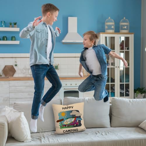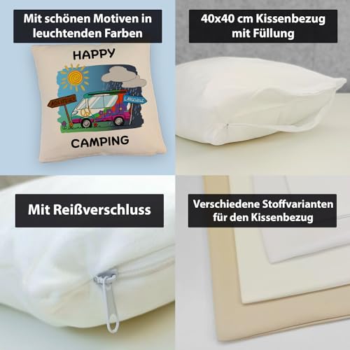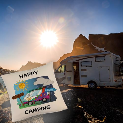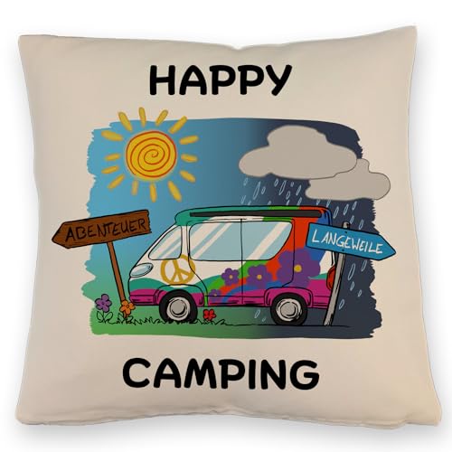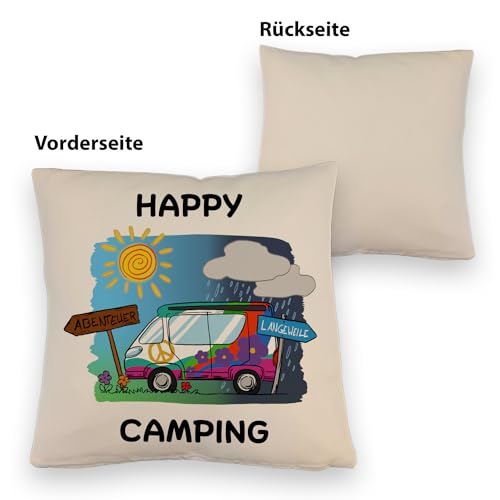 Lieferumfang: 1x Hippie Wohnmobil Kissen mit Leinenoptik mit Spruch Happy Camping