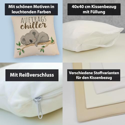 Auftragschiller ist der lustige Spruch auf diesem Kissen. Er spielt auf die faule und entspannte Natur des Koalas an und ist eine humorvolle Aufforderung, es dem Koala gleichzutun und einfach mal abzuschalten und zu relaxen. Also, legt die Füße hoch und seid ein Auftragschiller!