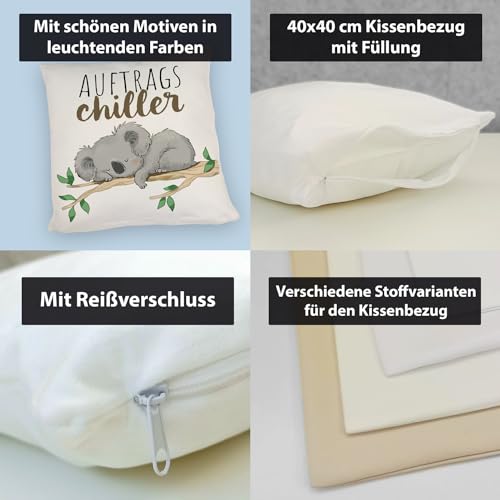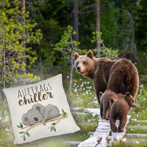 Auftragschiller ist der lustige Spruch auf diesem Kissen. Er spielt auf die faule und entspannte Natur des Koalas an und ist eine humorvolle Aufforderung, es dem Koala gleichzutun und einfach mal abzuschalten und zu relaxen. Also, legt die Füße hoch und seid ein Auftragschiller!