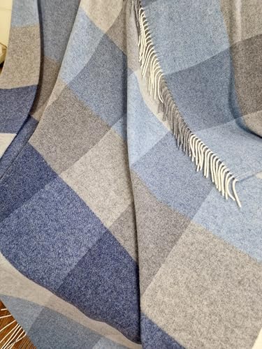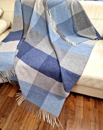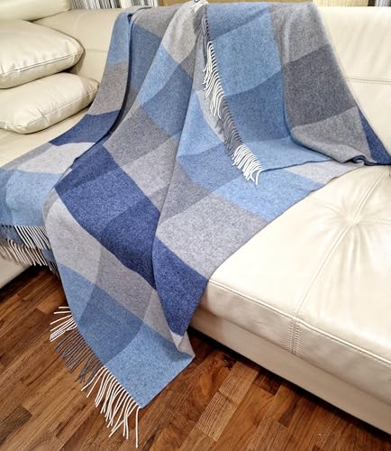 STTS International Kaschmir Decke Wolldecke Wohndecke 100% Merinowolle – Kaschmir – Mix 140 x 200 cm sehr weiches Plaid Kuscheldecke Faro (Blau-Grau-Hellgrau (Quadrate))