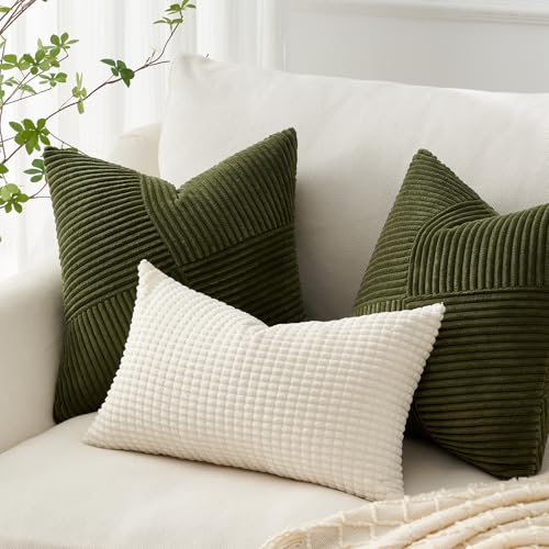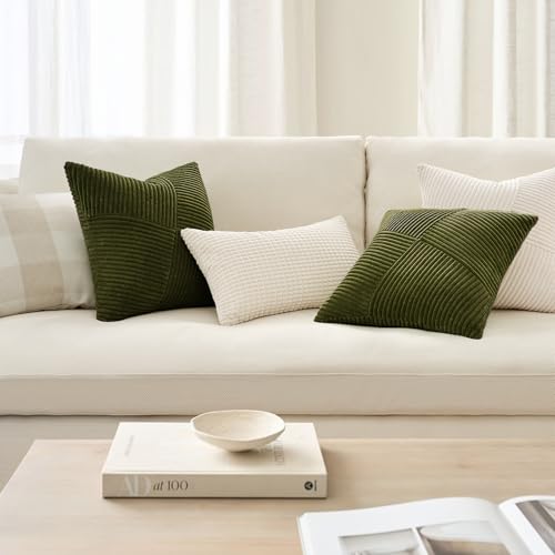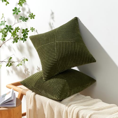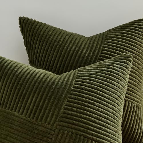 Topfinel Kissenbezug 45×45 Olivgrün Kordsamt 2er Set Windmühle Streifen Muster Kissenbezüge Kissenhülle Dekokissen Sofakissen Patchwork Design Deko Wohnzimmer Bett Schlafzimmer Sofa