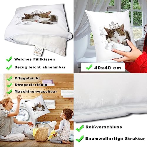 😻 WASCHBAR – Das spaßige Dekokissen ist anschmiegsam, atmungsaktiv und maschinenwaschbar. Das Set aus Zierkissenbezug und Kissenfüllung ist komplett aus 100% Polyester und dennoch auch für Allergiker sinnvoll. Das große farbenfrohe Katzen Design auf der Dekokissenhülle mit der Katzenprinzessin leuchtet nach mehrmaligem Abwaschen wie am ersten Tag.