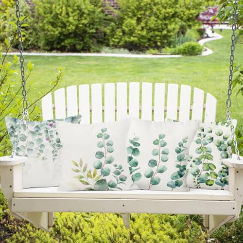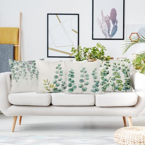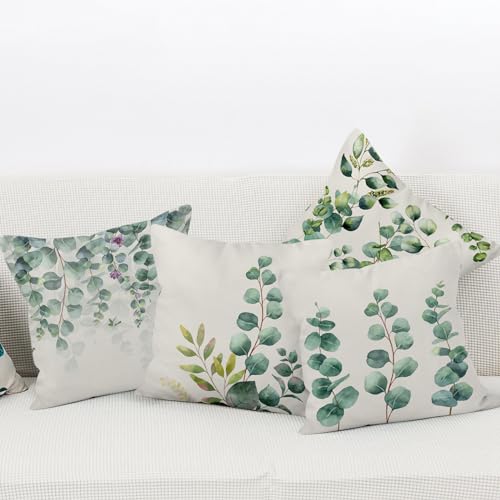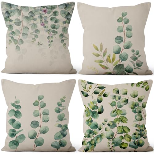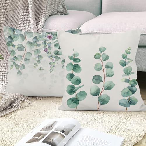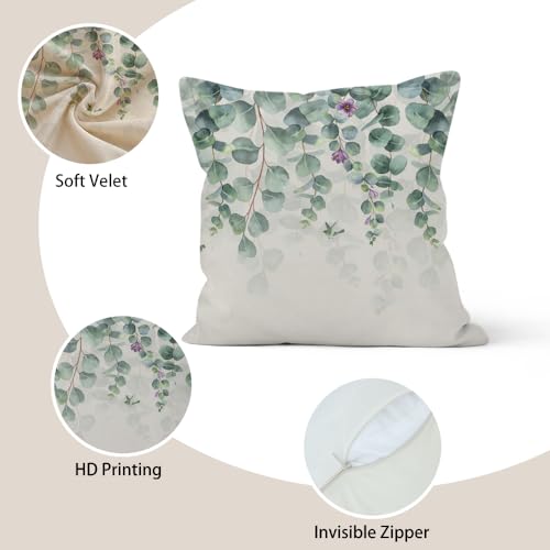 Uiiooazy Kissenbezug Eukalyptus, Kissenbezüge Grün Blätter Violett Blumen Vintage Quadratisch Kissenhülle Samt Zierkissenbezug für Sofa Couch Schlafzimmer Wohnzimmer Auto Zuhause, 4er Set, 60Bx60Hcm