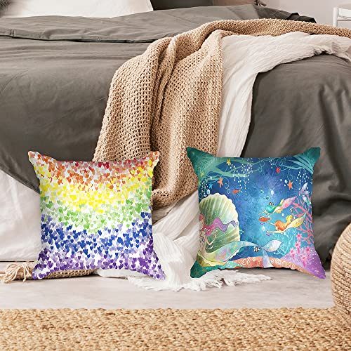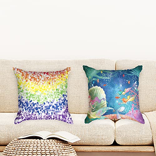 Ulticool – Kissenhülle – Regenbogen Herzen Meerjungfrau – Set von 2 Motiven – 45 cm x 45 cm – Dekokissen ohne Füllung – Kissenbezug Zubehör für Sofa/Bett