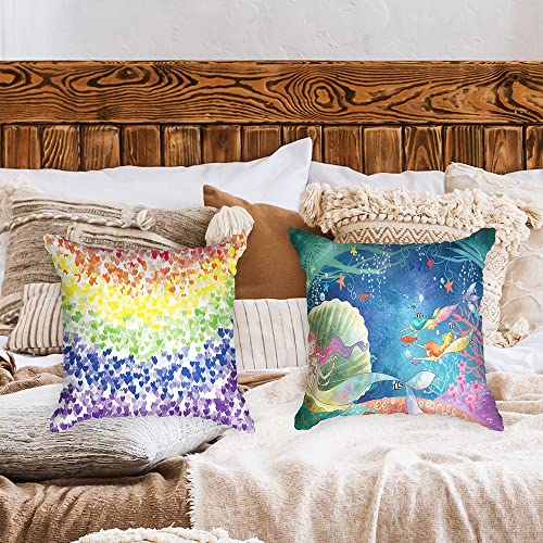 Ulticool – Kissenhülle – Regenbogen Herzen Meerjungfrau – Set von 2 Motiven – 45 cm x 45 cm – Dekokissen ohne Füllung – Kissenbezug Zubehör zugunsten Sofa / Bett