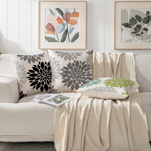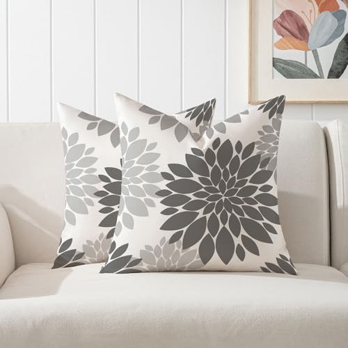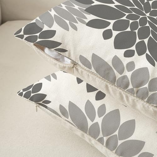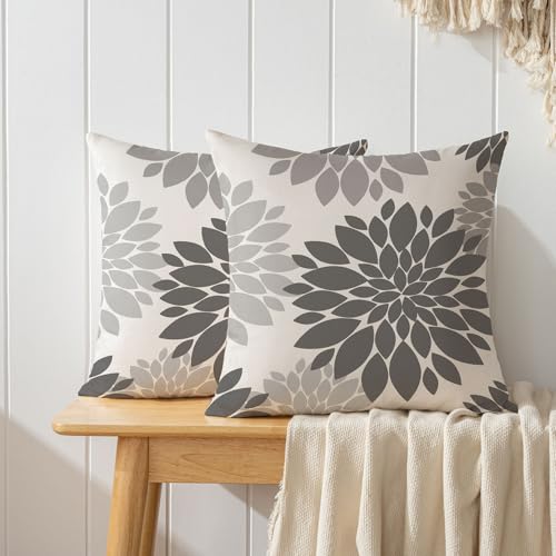 ViaElayu Outdoor Kissenbezug 45×45 Frühling Grau Blumen Kissenhüllen Zierkissenbezug Dahlien Wetterfest Dekokissen Kissen Couchkissen Sommer Kissenbezüge Wohnzimmer Garten Sofa Deko 2er Set