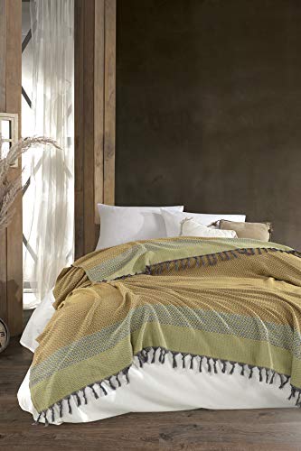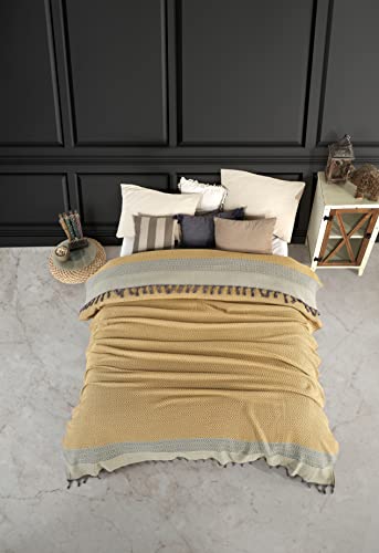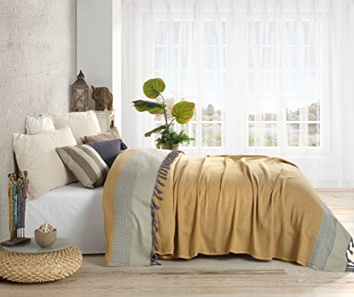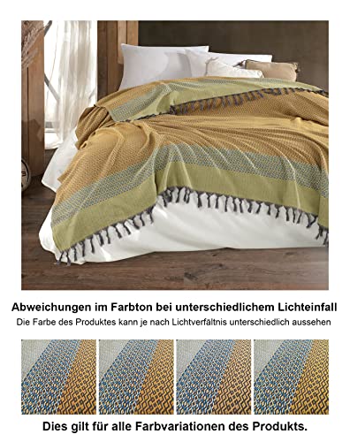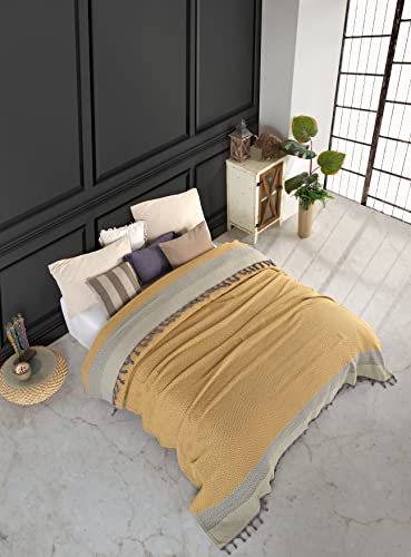 Wellstil® Nerthus | Reversibel Premium Tagesdecke • Gewebte Wohndecke • Handgefertigte Fransen • Bettüberwurf • Wendedecke • Extra-groß Kuscheldecke | Leicht | %100 Baumwolle | 200×250 cm (Gelb)