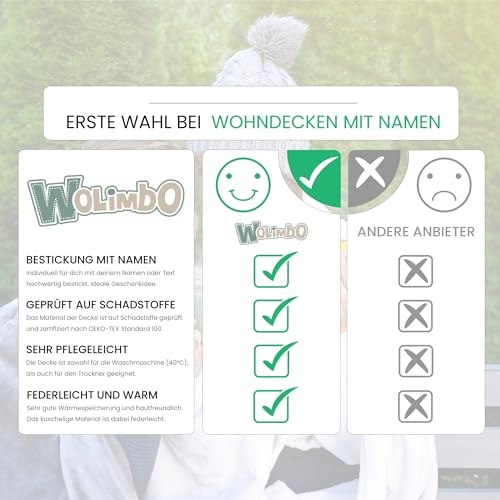 Wolimbo Kuscheldecke mit Namen – 200 x 150cm – schwarz – für Erwachsene und Kinder – Wohndecke Sofadecke nach Wunsch Bestickt