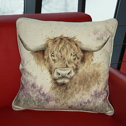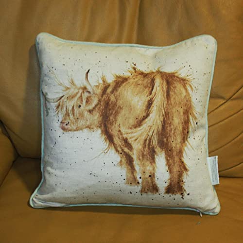 Wrendale Designs Baumwoll-Leinen Kissen Schottische Highland Kuh beidseitig bedruckt quadratisch mit verdecktem Reißverschluss, Feder-Füllung und konstrastfarbiger Bordüre