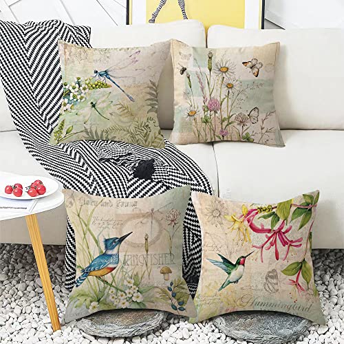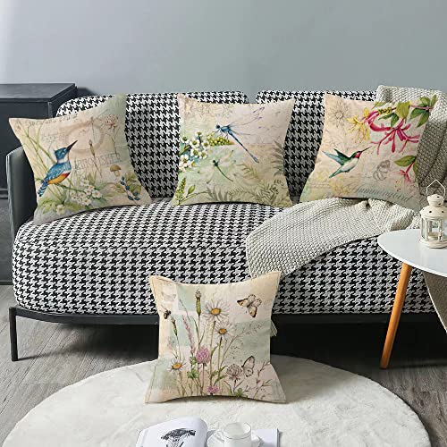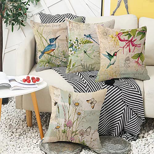 wyooxoo Dekorative Frühlingskissenbezüge, Leinen, Blume, Schmetterling, Bauernhaus, Kissenbezüge für Sofa, Couch, Wohnzimmer, Outdoor, 45,7 x 45,7 cm, 4 Stück