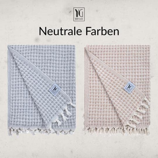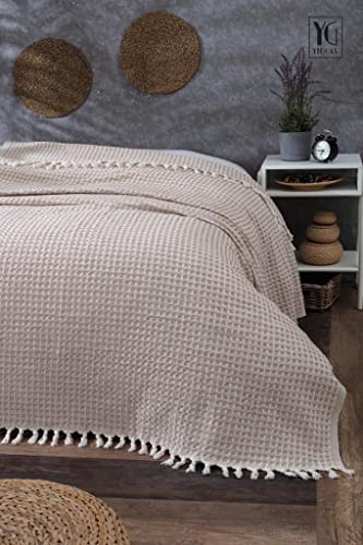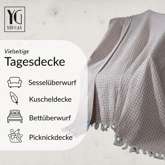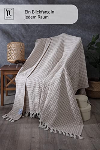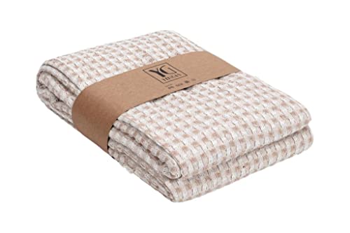 YENGAS Tagesdecke XL, 150 x 200 cm, Waffle Pique, Große Wohndecke, Bettüberwurf, Couchdecke, Überwurf Decke für Sofa & Bett, 85% Baumwolle & 15% Recyceltes Polyester, Waffelmuster, Beige