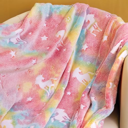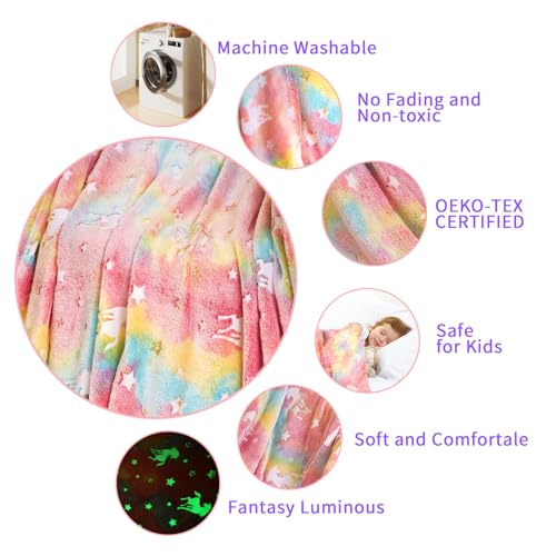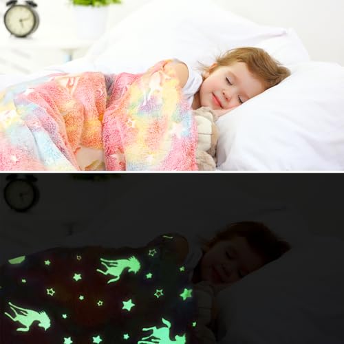 Luminous Kids‘ Blanket: 130×150 cm flauschigerFlanell über Sternen/Unicorn-Motiven. Nach Lichtabsorption leuchtet sie dunkel, schafft sichere Schlafatmosphäre.