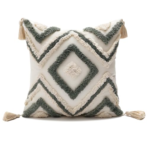 YULUOSHA Dekorative Boho Kissenbezug,Boho Kissen Beige Deko Baumwolle Dekokissen Marokko getuftete Kissenhülle Kissenbezüge Quaste für Sofa Schlafzimmer Wohnzimmer Dekor (1, grün, 45 x 45 cm)