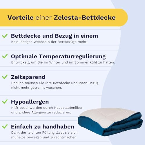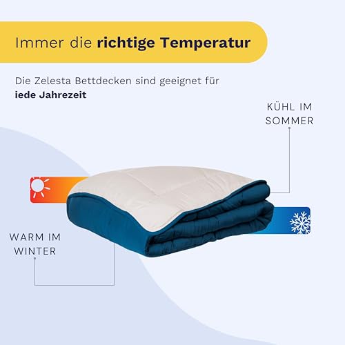 „- 4-Jahreszeiten-Bettdecke: optimale Temperaturregulierung. Das Zelesta Easybed ist so konzipiert, dass es temperaturregulierend ist. Die Bettdecke hält dich im Winter warm und im Sommer kühl und ist dabei ausreichend atmungsaktiv. Dadurch eignet es sich für alle Jahreszeiten, in denen die meisten Menschen ohne zusätzliche Bettdecken genießen können. Jedoch wenn du ein kälteempfindlicher Mensch bist, kannst du dich dafür stimmen, in kalten Winternächten zwei Schichten übereinander zu legen.“