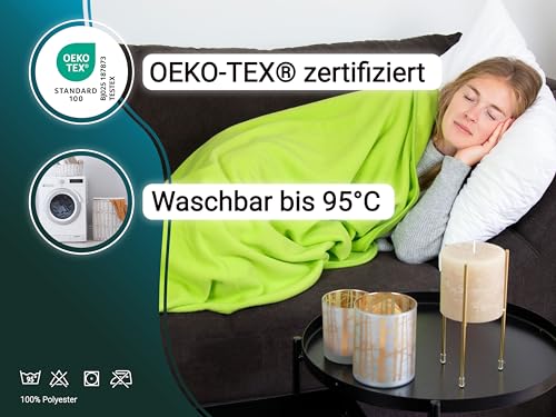 Fleecedecken sind kuschelige Begleiter in vielen Bereichen und sorgen im Handumdrehen für Gemütlichkeit. Diese kuschelig weiche Wohndecke in der praktischen Größe 130/170 cm ist eines dieser absoluten Multitalente und vielseitig einsetzbar. Als gemütliche Couchdecke, als Babydecke im Kinderbett, als Schondecke, für kalte Abende auf dem Balkon oder bekannt als als Haustierdecke. Gefertigt wurde die langlebige und allergikergeeignete Sofadecke aus 100% Polyester mit einem Gewicht von 260 g/qm. Ein hochwertiges Einfassband verhindert das Ausfransen der Deckenränder. Abstimmen Sie aus vielen tollen Farben Ihren Favoriten für Ihr Zuhause aus.